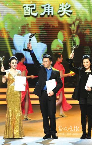 陈明矿(中)获得第25届“白玉兰戏剧配角奖”榜首。