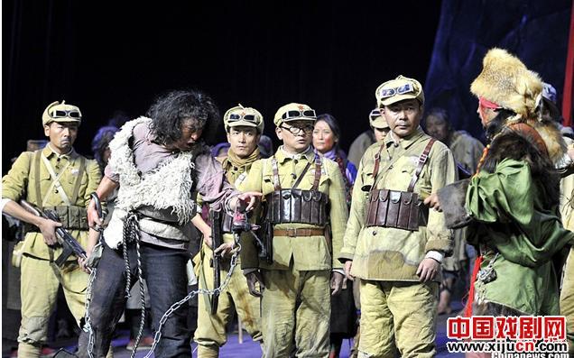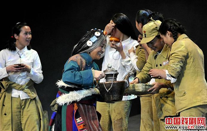 11月2日晚,大型民族话剧《解放 解放》在拉萨上演。《解放解放》全剧以倒叙的表现形式,讲述十八军某部后卫连(收容队)克服重重困难进军西藏的故事。该剧讲述了一群满怀理想主义、胸怀天下、平凡而坚韧的革命战士在行军过程中搜救伤员和掉队同志、找回走失牦牛和骡马、追赶大部队,最后胜利到达拉萨的故事。图为话剧演出现场。
