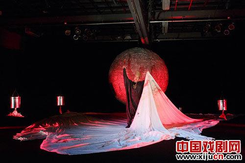 《审判乌布王》由一个银色球体、一块巨大的白布,和众多悬挂的铁桶、衣架构成舞台,观剧的过程中,逐渐看到了它们随着剧情的发展,不断被赋予各种不同的意义。如银球上变换不同的投影场景、白布制造出扭曲的影像、铁桶代表波兰的臣民等都让观众眼前一亮。