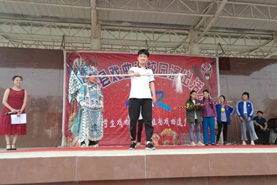 主持人还向师生们讲解了豫剧的基础知识,介绍了生旦净丑等角色的区分,并邀请同学们进行现场互动,体验“唱念做打”四种基本功动作,现场气氛活跃,同学们情绪高涨,上场的同学们和老师们互动一起耍花枪、学唱腔等等,一个个经典动作,一句句经典唱词,让同学们感受到了豫剧艺术的魅力。