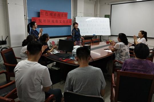 张红茹向居民们介绍了戏曲的由来、角色、服装等,现场以一对一的方式进行指导,从唱词到动作、从身段到眼神,一点一滴都凝聚着对传统文化的热爱。学员们受到感染,也更加聚精会神,以较优美的唱腔获得老师的肯定与赞扬。教到兴起时,张红茹还即兴为大家表演了一段戏曲选段,居民们热情高涨,课堂文化氛围浓厚。