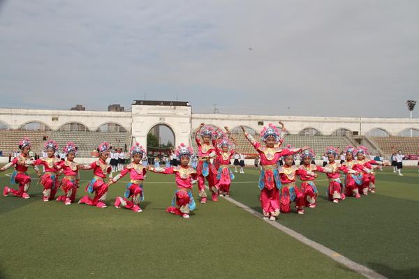 体育节上,260名孩子身穿整齐的校服,头戴戏曲脸谱面具,手执花枪,精彩出场。