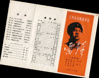 这张已泛黄的节目单长26.5cm,宽19cm,呈三折两面。它是1963年3月江苏省话剧团在南京公开演出十场话剧《雷锋》时印制发行的。节目单正面右侧为大红底色,上端印有“江苏省话剧团演出”,中间印有雷锋同志的木刻像,下面是毛泽东手迹“雷锋”二字,再下面标注着“编剧:费克、陈坤;执笔:费克;导演:王凤;主演:张辉。1963·3·南京”字样。中间为“演员表”,记录着当年的演出阵容。其中,张辉、王兆良、王志(饰雷锋)、宋佩英(饰童年雷锋),田英(饰赵营长),申良、李甡茂(饰指导员)。节目单左则为“场序”,下端印有音乐、布景、灯光、服装、化装设计、舞台监督人员名单。其背面两侧分别印有毛泽东题词“向雷锋同志学习”和“演出前言”。该节目单设计简洁,色彩明快,是一张不可多得的红色藏品。