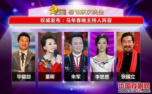 今天上午,2014央视春节联欢晚会微信官号权威发布春晚主持阵容,分别为张国立、朱军、董卿、毕福剑、李思思。从名单看,阵容由去年的六人变成五人,央视当家花旦董卿和“春晚老人”朱军依旧榜上有名,继续坚守站好年末最后一班岗;综艺频道“新一姐”李思思和毕福剑获得这个来之不易的机会,将连续第三年站上春晚舞台;而影视大腕张国立代替离职央视的李咏,首度主持春晚让人充满期待,之前网络盛传的冯小刚夫人徐帆有望加盟的消息被彻底否认。