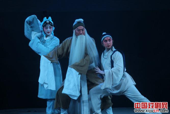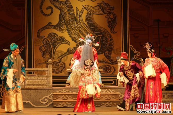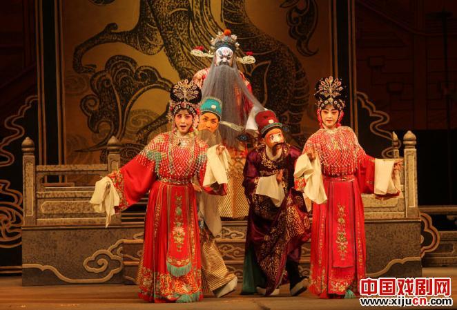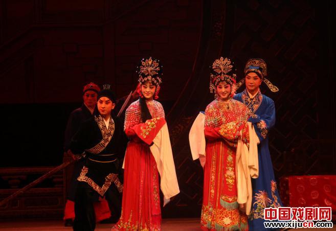 陇剧的唱腔非常类似秦腔,但是听起来又比秦腔委婉、轻快,《枫洛池》这部戏在唱腔设计采用了一唱多合的“喊簧”唱法,这种唱法在甩腔处采用合唱,有点类似川剧帮腔,但又有不同,听起来很舒服。