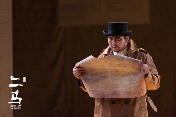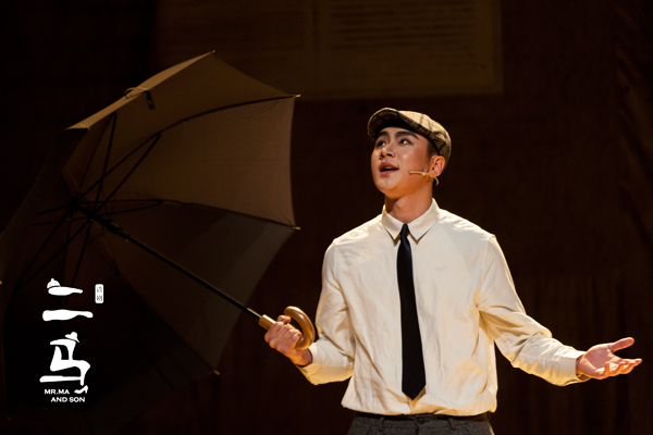 一组移动的英国旧报纸,一串悬于半空的英国女帽,五个男演员穿着风衣、撑着长柄伞走上舞台。话剧《二马》的亮相,是描白一般的英伦风格。
