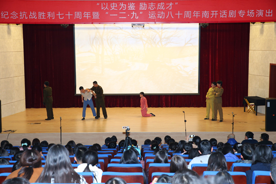 12月4日晚,“以史为鉴,立志成才”纪念抗战胜利七十周年暨“一二·九”运动八十周年南开话剧专场在津南校区综合业务西楼报告厅上演。南开大学党委副书记、副校长杨克欣出席活动。校史研究室、校团委、环境科学与工程学院负责人以及350名师生党员一同观看了演出。