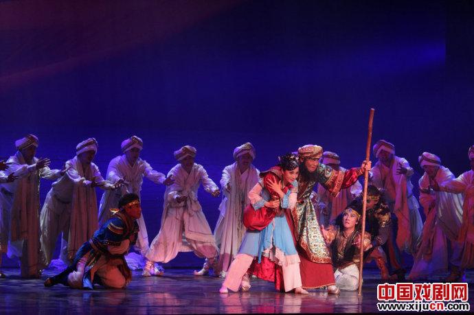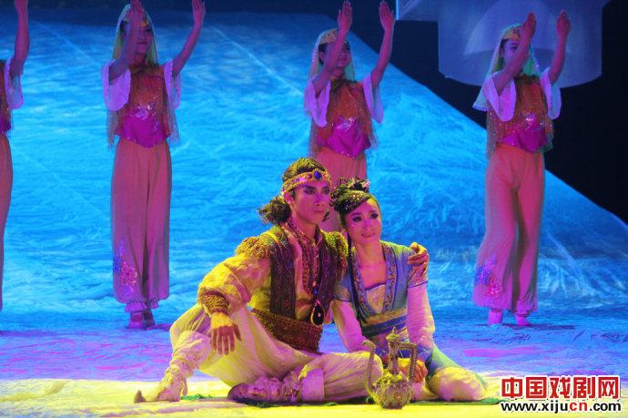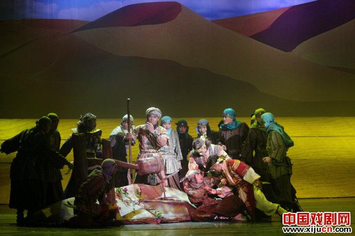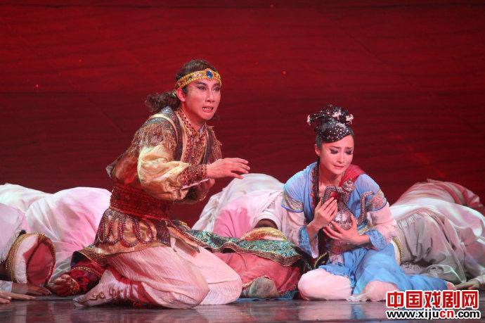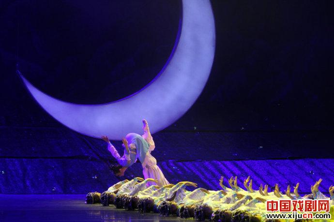 舞剧《月上贺兰》无论在舞蹈上、音乐上,还是在舞美上都做的比较足,但是比较缺憾的是文本较弱。其实整个故事主要在表现穆斯林与汉家姑娘的相爱的故事,通过二人的相爱来反映民族之间的融合与和平共处的大主题。但是本剧似乎在这二人相爱的主题外,设计的旁枝过多,反之爱情成分呈现的却很弱,且很突兀,比如穆斯林商队一个成员对于珠宝的眷恋,并且梦见美女佳肴,给观众呈现了一个贪婪享受的商人形象,但是这与之后的剧情并没有关系;在表现纳苏与海真相爱上,相爱的太突然,重聚的太夸张,并且在几处情感转折上也不是特别不流畅;还比如穆斯林商队二次遇见强盗,第一次绕道而行,第二次遇见只描写了整个打斗场面,并没有表达出强盗出现的目的是什么,难道只是为了杀死穆斯林商人;穆斯林葬礼的出现似乎也可有可无,对于剧情进展并没有太大的作用。其次,本部戏很多地方交代的并不是特别的清楚,最明显的是本部戏的标题是月上贺兰,而整部戏并没有着重描写贺兰,包括商人死之后,嘱咐其子可以东回贺兰,弄不清楚这样说的目的是为了什么,难道是眷恋贺兰的土沃水肥吗;还有穆斯林商队急切返乡,也没有交代的特别清楚。最后,本部戏在剧目文字叙述上,有些过于直白和牵强,当然这也表现在了剧情之上。