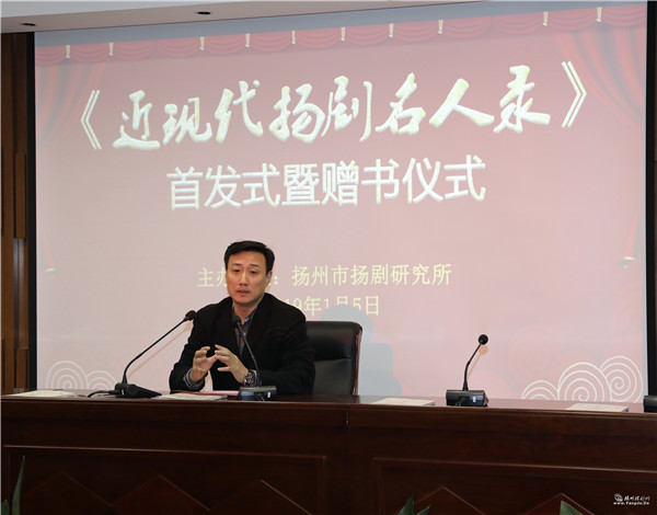 1月5日下午,新书《近现代扬剧名人录》在位于扬州戏曲园内的扬州市扬剧研究所报告厅举行首发式暨赠书仪式。扬州市委宣传部副部长、市文广新局局长季培均,市文广新局副局长、市扬剧研究所所长李政成,市文广新局艺术处处长朱运桃等嘉宾以及老艺人代表、各扬剧团演员代表、扬州艺校学生代表、各地扬剧协会代表一百余人参加了此次活动。