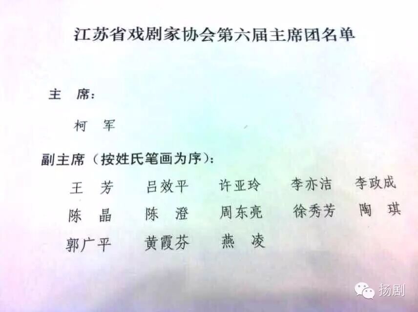 江苏省戏剧家协会第六次会员代表大会于2月12日在南京召开,来自全省各地的戏剧艺术家代表参加了大会。国家一级演员、省演艺集团副总经理兼艺术总监柯军当选新一届剧协主席。扬州市扬剧研究所所长李政成当选新一届剧协副主席。