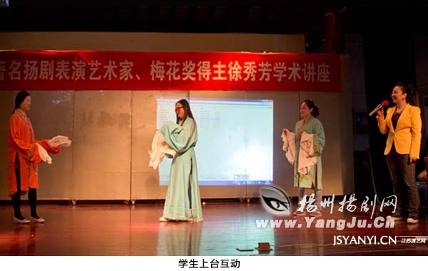 讲座中,徐秀芳以深入浅出的讲解,向学生们介绍了扬剧女腔和剧种特色,并现场演唱了扬州小调和扬剧的经典名段,令学生们对扬剧有了一个直观而详细的了解。扬剧团优秀青年演员赵玲玲则为同学们展示了剑舞和彩绸舞等戏曲基本功,唱演讲相结合的方式生动有趣,深深的吸引了全场同学的注意力,引发了他们对扬剧艺术的兴趣及关注。在讲座最后的互动环节,学生们争相上台,穿上戏服,学习戏曲程式动作,感受传统戏曲的古典魅力。