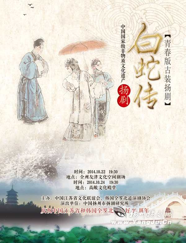 【扬州扬剧网消息】为庆祝中国江苏省和韩国全罗北道结好20周年, 受江苏省文化厅委派,10月21日扬州市扬剧研究所一行32人前往韩国全罗北道,进行为期6天的文化交流活动,22日和24日分别在韩国全州友津文化空间艺术剧场和高敞文化殿堂上演青春版古装扬剧《白蛇传》。此次赴韩国演出,排出了最强的阵容,优秀青年扬剧本科生演员悉数登场。