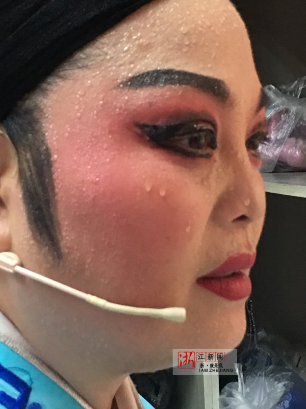 一场下来,应铭春脸上满是汗水。转眼一出戏落幕,下了台近看,记者发现应铭春的脸上满是汗水,两层衣服早已湿透。高温天演戏,身上出再多的汗也能忍,最困难的还是脸上止不住的汗水。“最怕汗流到眼睛里。眼睛辣得睁也睁不开,还要控制情绪将戏唱好。”应铭春说,“看到大家大热天还跑来看戏,热情地鼓掌,就觉得再苦再累都值了。”