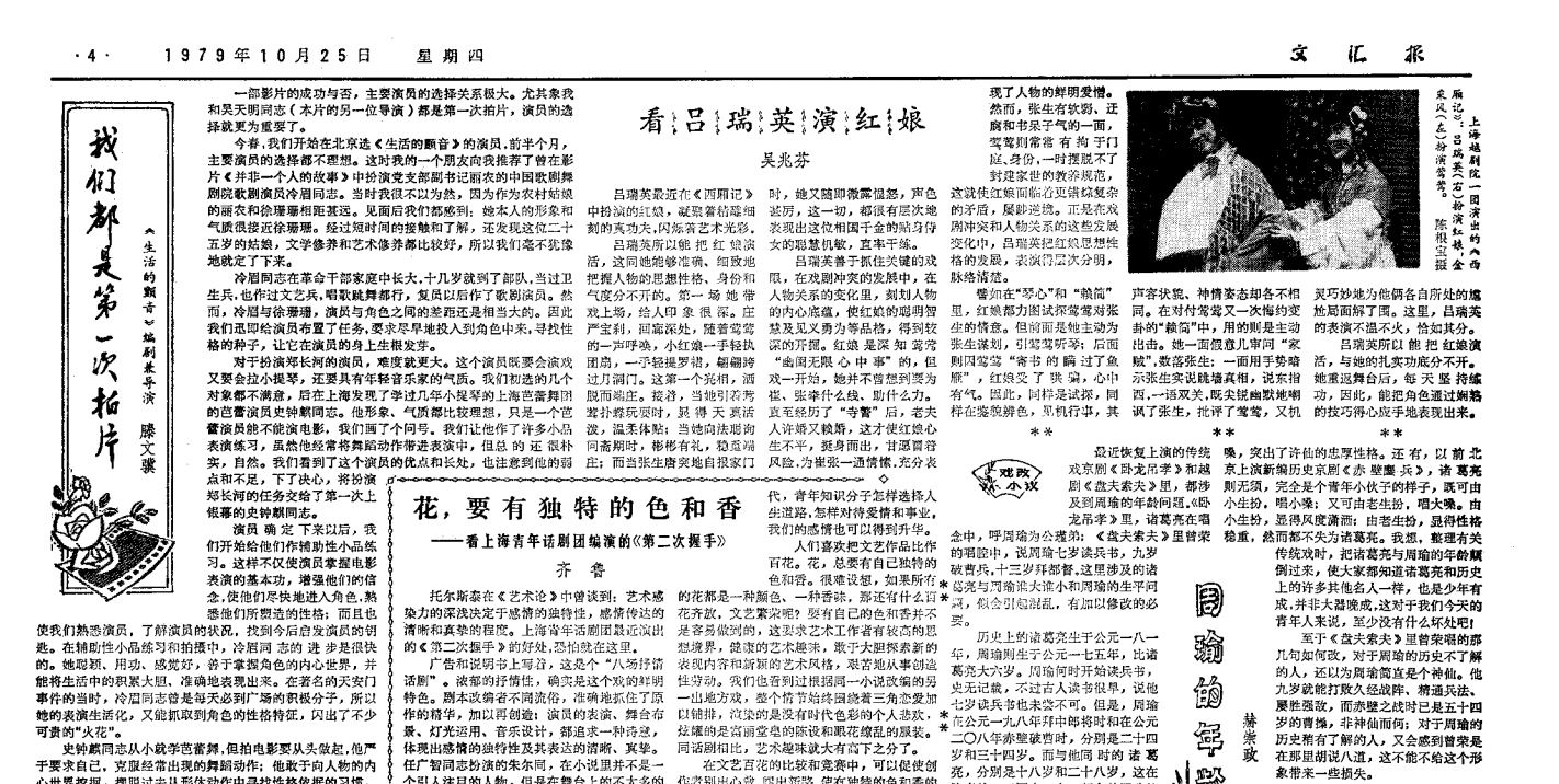 ▲图为《范瑞娟表演艺术》附吴兆芬于1979年10月25日刊载在文汇报的一篇《看吕瑞英演红娘》,或可从中窥见其越剧审美旨趣,是以缅怀吴兆芬老师。