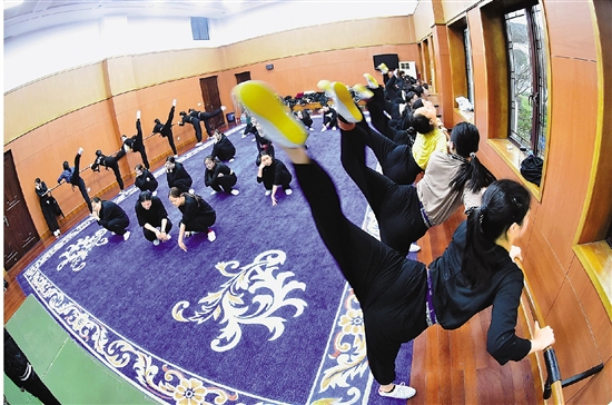 清晨,嵊州市越剧艺术学校的学生在苦练基本功。