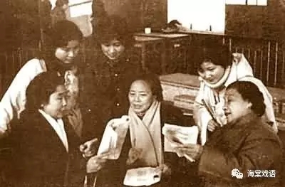 毛佩卿(中)和叶小宛(右)、尹瑞芳(左)与学生们一起探讨剧本