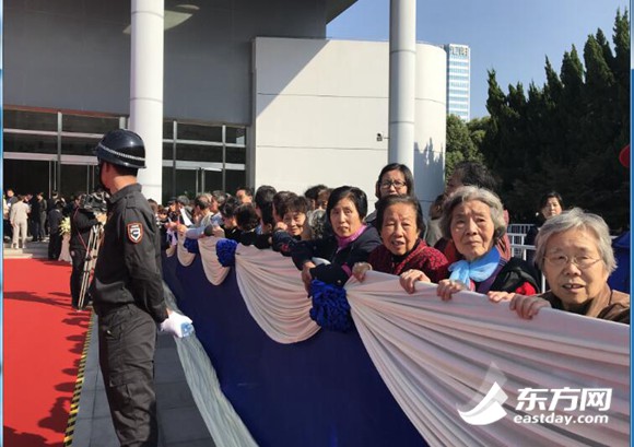 龙华殡仪馆外,大批戏迷一早就来到龙华殡仪馆,送别傅老最后一程。有的还专程从外地甚至美国赶来,一位余先生手拿自己写的诗句,上面将越剧十姐妹的名字都融入进去,向一个越剧时代的终结表达缅怀。