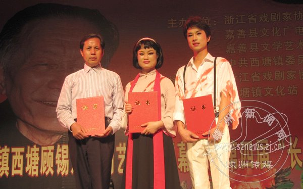 日前,顾锡东戏剧艺术节暨第四届“长三角”越剧票友大赛在西塘古镇圆满落幕。我市三位选手获十大名票称号。本届“长三角”越剧票友大赛由浙江省戏剧家协会和西塘镇人民政府共同主办,受到长三角地区众多票友的热烈响应,共有近千名选手参赛,经各地28场次的层层预、复赛选拔,有40名选手在5月13日当天相聚古镇西塘展开最后的角逐。经过激烈的比赛,我市参加决赛的3位选手均获“十大名票”称号,其中屠丽蓉获青年组十大名票银奖;钱波、钱樟明获“十大名票”称号,获奖比例为所有参赛队之最,领队黄政还获得最佳组织奖,充分展示了越剧故乡票友的演唱实力。图为钱波和屠丽蓉在演出《刑场上的婚礼》。