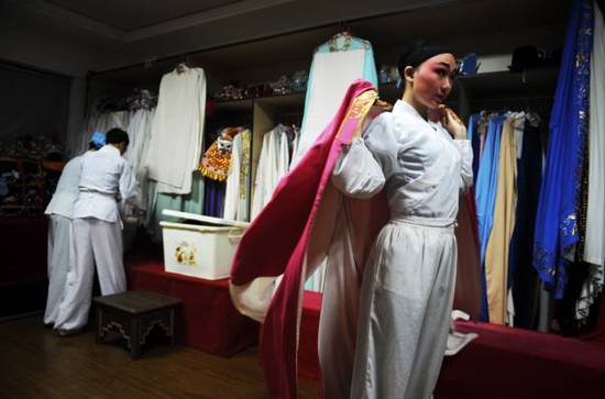 嵊州越剧艺术学校传承班学生俞庆庆在学校剧场后台穿戴戏服(4月20日摄)。