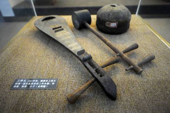 这是1921年初,越剧史上成立的第一班乐队所用的三件乐器:和尚鼓、板胡、斗子(4月21日摄于嵊州越剧博物馆)。