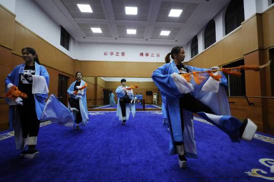 嵊州越剧艺术学校的学生在教室内练习越剧动作(4月20日摄)。