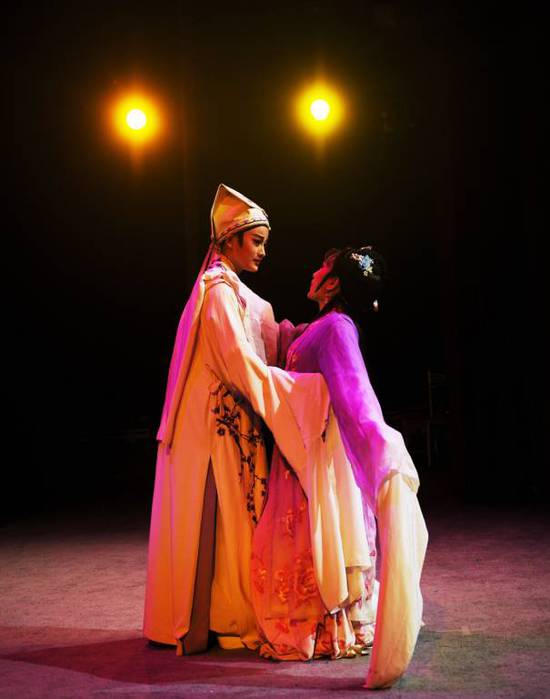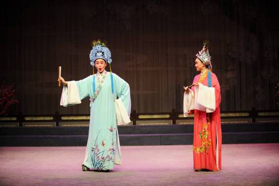 嵊州越剧艺术学校传承班学生田园园、王肖龙(左)在学校剧场表演越剧《牡丹亭》(4月20日摄)。