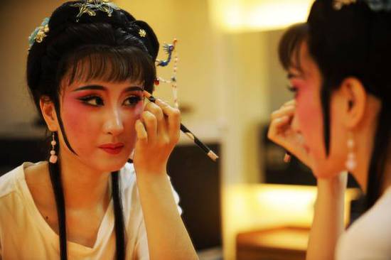 嵊州越剧艺术学校传承班学生田园园在学校剧场后台上妆(4月20日摄)。