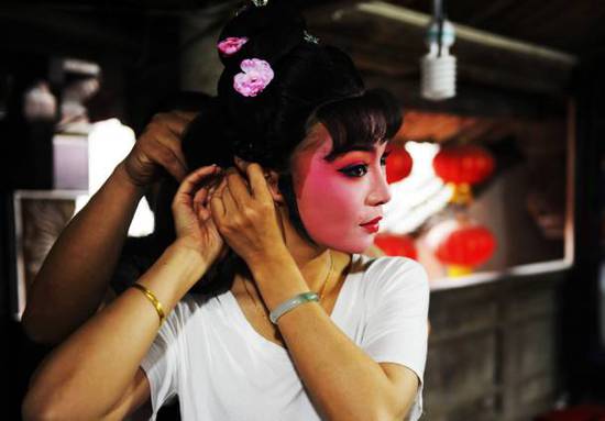 在嵊州市施家岙村,民间艺人薛黎艳在村中戏台的后台上妆(4月21日摄)。