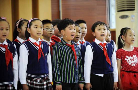 嵊州市城南小学学生在学校里练习越剧唱腔(4月20日摄)。