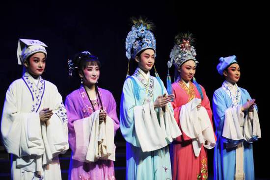 嵊州越剧艺术学校传承班学生在学校剧场表演后谢幕(4月20日摄)。