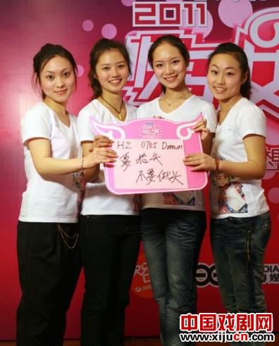 快乐女声杭州唱区报名第二天,火爆如开唱首日,一大早报名现场就排满了等候报名的女生。颇为巧合的是,继第一天的higirl美腿组合后,杭州唱区次日迎来了一个组合,杭州某艺术学校越剧四小花旦组成drem组合,渴望实现艺术梦想。