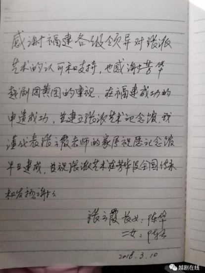 在各级领导的关心下,秉持黄国庆团长的“以尹派为主,兼顾其他流派”发展理念,我团为保护、传承和弘扬“越剧〔张(云霞)派〕”做了大量的工作,取得显著的成绩。特别是在非遗申报方面也得到你们的大力支持,2017年1月“越剧〔张(云霞)派〕”被列入第五批福建省非物质文化遗产代表性项目名录,2018年2月张派传人郑全被确定为福建省第四批非物质文化遗产代表性项目代表性传承人。