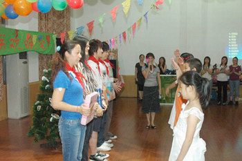 晚会开始,三位小朋友用充满感情的声音朗诵了诗歌《生死不离》,晚会进入了第一个主题“为四川加油,为灾区小朋友祈福”。小朋友们拿着写满对灾区儿童祝福的心意卡,来到心愿树前,用稚嫩的声音讲出自己的祝福:“希望四川的小朋友能开开心心。”“希望四川人民能够早日重建家园。”……简短的话语,包含了对四川同胞的关心。大爱无疆,在灾难面前,小朋友们拿出了自己的钱罐,掏出零用钱和利是钱,给灾区捐献爱心。在灾区急需用血时,我院姚雅莹、陈家鼎、梁鹏、欧云滔、李娜等员工马上到献血点捐血。小朋友们得知后,在晚会上为他们戴上了鲜艳的红领巾,并敬上队礼,表达自己对献血者的敬意。