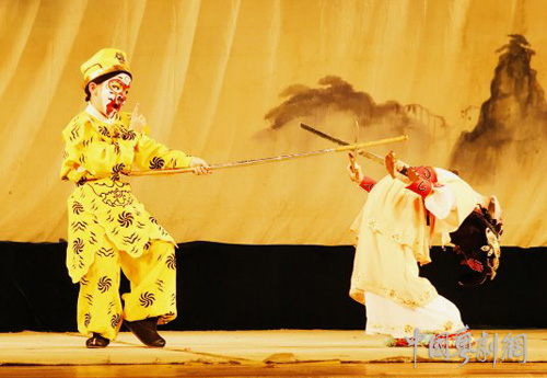 最后,压轴好戏《猴王借扇》上场,但见两个小演员踏正锣鼓点,恰到好处地配合对打、亮相,耍枪耍刀、金鸡独立、把子功、刀功、脚功、腰功等等,发挥得淋漓尽致,吸引了不少观众的眼球。须知,这两个小演员只是六龄童,还在读幼儿园大班,而且饰演老孙者是重庆人。他们学习此戏才仅仅一年,表现却如此夺目,真是成绩喜人!