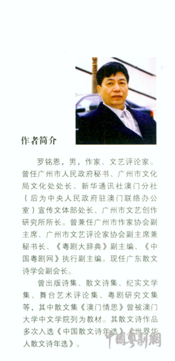 由广州文学艺术创作研究院专项出版资金支持的《南粤艺苑丛书》之《粤海艺踪》近日由花城出版社出版发行。该书由罗铭恩著述,全书分为“人物篇”、“剧目篇”、“学术篇”三个版块。书中介绍了若干著名粤剧表演艺术家、编剧家、粤剧研究专家的人生历程;分析了一些原创剧目的风格特征与艺术特色;对粤剧及其他戏曲的一些学术问题进行了有益的探讨。文中观点鲜明、文笔娴熟、题材新颖,涉及的话题丰富,既有一定的专业艺术价值,又有很强的可读性。其中不少文章曾在国内知名的刊物、报纸发表,受到戏曲界人士的重视。