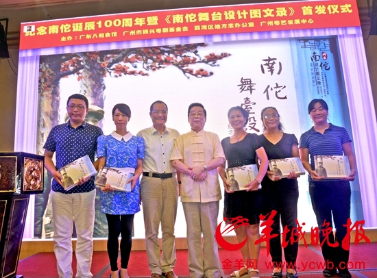 纪念一代粤剧舞台舞美大师南佗百年华诞 陆志强(左2)小神鹰(右3)向文化部门代表赠送《南佗舞台设计图文录》 郑迅摄