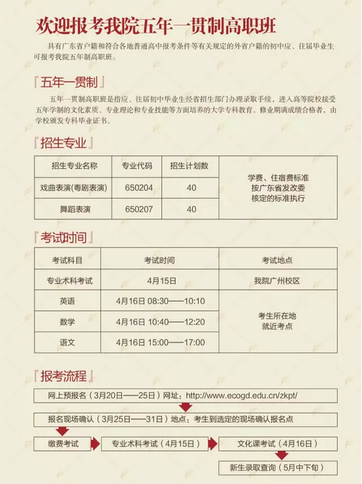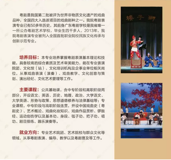 广东舞蹈戏剧职业学院——五年一贯制招生啦!本次招生专业中有戏曲表演(粤剧表演)专业,应届往届初三毕业生,广东户籍或外来务工人员子女(有三年广东学籍)者均可报名,五年一贯制直接大专毕业,可继续升本科,免去高考。有意者请于20日到25日网上报名。