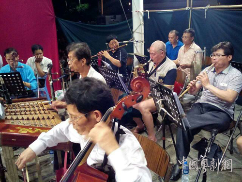 本文作者在随东莞一个业余粤剧团巡回演出(吹箫者)