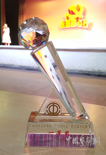 大会还对“‘工会好声音’职工歌手比赛””活动进行了颁奖。广州市工人粤剧团团长傅敏华以一首粤曲小调《渔歌晚唱》夺得了一等奖,从市总工会主席赵小穗手中接过了水晶咪奖座。作为团长的傅敏华,多年来一直致力剧团建设,在对粤剧文化的传承与发展工作上不遗余力。这次参加歌手大赛,也是以粤曲小调应赛,她把推广粤剧粤曲文化作为己任。对粤剧的执着与热爱,傅敏华确实是做到不忘初心,永葆初心!