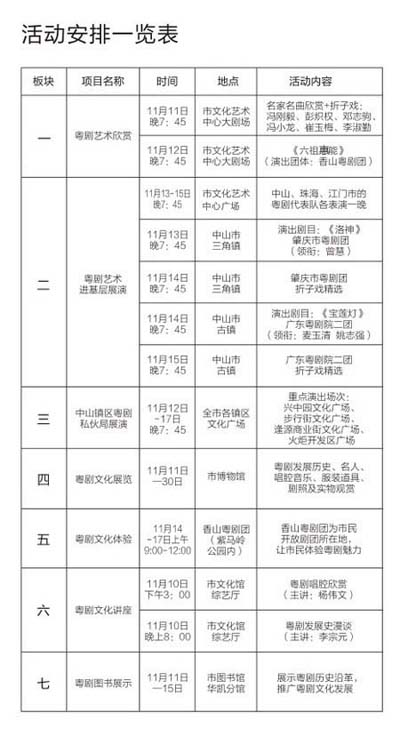 本次粤剧文化周分为粤剧艺术表演、粤剧文化展览、粤剧知识讲座、粤剧场景体验、粤剧主题图书(电子出版物)阅读推广、珠中江私伙局展演、中山市爱好者表演活动等七大版块、30多项活动内容,涵盖了粤剧艺术的各个方面,不仅有传统的粤剧名家名曲欣赏和私伙局展演,还特别设置了粤剧知识讲座、粤剧文化展览和场景体验,让市民观众不仅可以欣赏到原汁原味的粤剧艺术,还可开拓粤剧文化视野,近距离了解粤剧发展历史,增进对优秀传统文化的认同,感受粤剧文化内涵,认识粤剧作为世界人类非物质文化遗产代表作的深厚魅力。