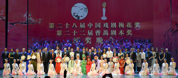 本届梅花奖的获奖演员,以及往届梅花奖得主及艺术家为现场观众带来了一台精彩的颁奖仪式演出。分别有广州粤剧院花旦、梅花奖得主崔玉梅演唱的戏曲歌舞《中国梦·梅花梦》、昆曲《牡丹亭·惊梦》、婺剧武戏《白蛇传·断桥》、戏曲水袖展示《国色天香》、男声独唱《滚滚长江东逝水》、粤剧《红的归来》选段、京歌《我是中国人》、歌舞《梅花颂》等节目。颁奖典礼上,组委会还为广州颁发了梅花奖承办纪念匾。