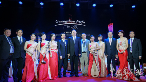 广东音乐曲艺团6位年轻广东音乐演奏家在现场为来自世界各国嘉宾们演奏了广东音乐经典曲目,柔润优美的音色、神奇悠扬的旋律,打动了世界各国参加达沃斯论坛的嘉宾,博得一阵阵喝彩声。广州市委书记任学锋、世界经济论坛主席施瓦布教授及夫人等近500位与会政要、跨国公司高层和社会知名人士出席了“广州之夜”活动。