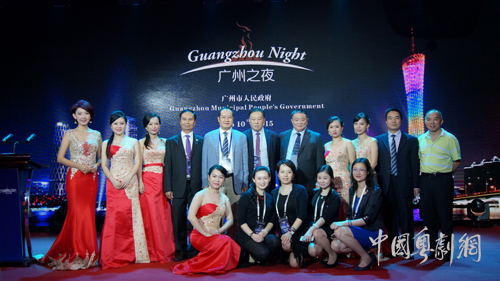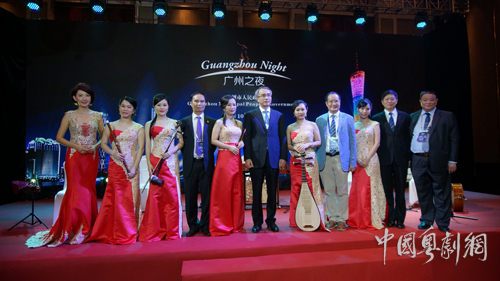 中共广东省委常委、广州市委书记任学锋,中共广州市委常委、市委秘书长陈国,广州市文广新局局长陆志强等领导与广东音乐曲艺团演奏家合影。