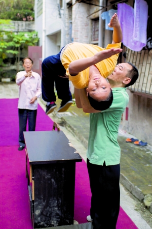 叶兆柏(前)在指导鹏仔练功。