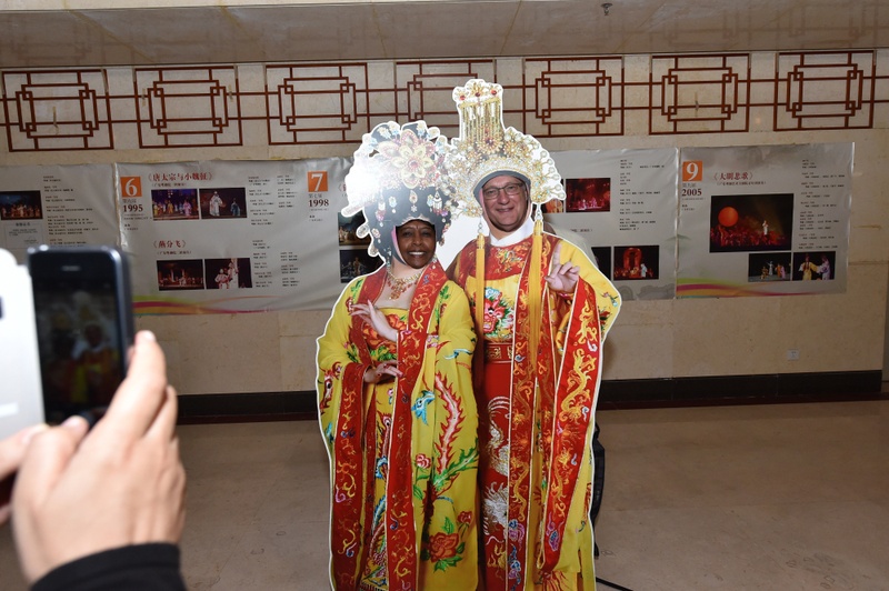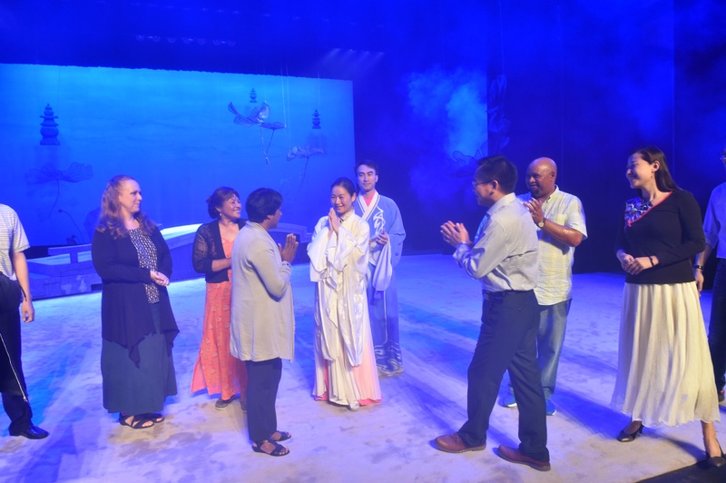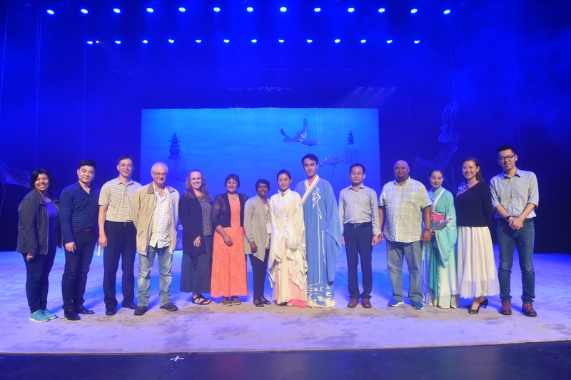 4月26日日下午,来自南非开普敦大学孔子学院教育工作者访华团、南非开普敦大学孔子学院中方院长覃胜勇,以及广东省国际文化交流中心副秘书长林曙光等一行十人到我院进行参观交流。访华团的人员步入广东粤剧艺术粤艺中心大堂,马上被各种富有岭南艺术特色的粤剧演出海报吸引,纷纷举起手机与海报中的剧中人合照。随后他们来到演出剧场观看了国家一级演员曾小敏、文汝清主演的《白蛇传·情》的排练。