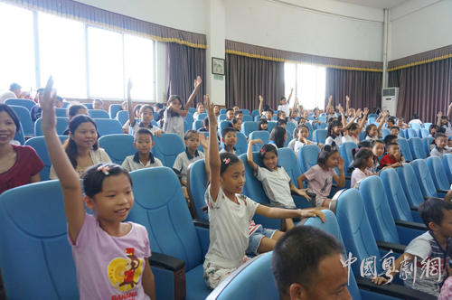 演出现场,司仪特意在每个折子戏之间穿插讲解粤剧的基本知识。此外,每场演出都设有演员与学生互动的环节,在演员的教导下,同学们学习“耍水袖”、“把子功”等戏曲表演动作,过足了“台瘾”。