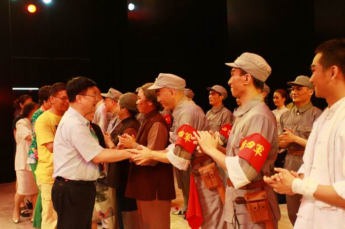 演出结束后,广东省文化厅厅长方健宏以及领导嘉宾上台与参演演员逐一握手
