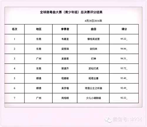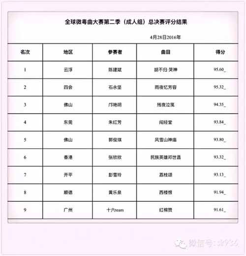 经过一番龙争虎斗,来自 云浮的陈建斌凭借过硬的唱功斩获全球微粤曲大赛第二季总决赛成人组的金奖,而来自东莞的韦嘉宜则获得青少年组的金奖。成人组的银奖由石永坚夺得,青少年组的银奖由梁莞琪获得。成人组和青少年组的铜奖分别由邝艳明和吴碧君获得;而成人组的最具网络人气奖以10202票的黄乐泉夺得;青少年组的最具网络人气奖由周栩晴获得,她的得票数是4448票;创新奖由十六team获得;各选手得分顺序如下图: