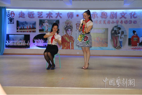 琼霞老师先通过讲述粤剧的历史、行当、服装、唱腔和粤剧的四功五发等基本知识,向老师们和孩子们展示了粤剧艺术的文化魅力及艺术地位;观看完学员们的表演后,琼霞老师再强调了粤剧“九声六调”中规范咬字的重要性,它直接影响了整场粤剧演出的韵味,以及在演出中摆功架与身体重心的协调也会对整体的演出效果产生重要的影响。她还告诉我们:“粤剧演出一定要真看、真想、真感受。每一个演员都要用心体会人物角色,因为动作是人物内心世界的外化。所以,每一位粤剧演员必须把细节做好。”琼霞老师还亲自给学员们示范动作,甚至连每一个眼神、每一个动作、每一个手势都讲解得非常深入。她严谨的治学态度和对艺术的执着追求令在场的每一位师生都为之敬佩。
