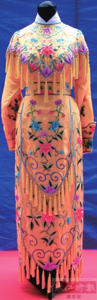 又如“靠”,是粤剧中男女武将用于作战场合的戎装,圆领窄袖、双肩及上臂有蝶翅形绣片覆盖,背上扎“背壶”,插四面三角旗。